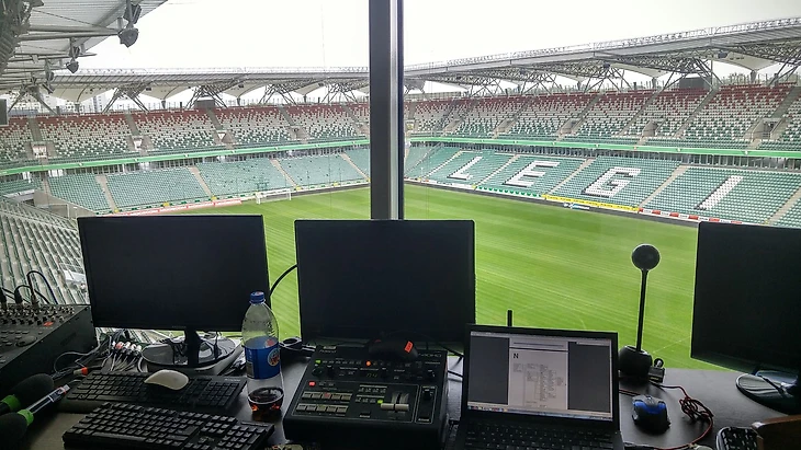 Позиция диктора, а заодно и администратора интерактивных экранов и звукорежиссера, расположена в углу стадиона. Вид открывается отличный, но только если смотреть в окно, а не экран монитора.