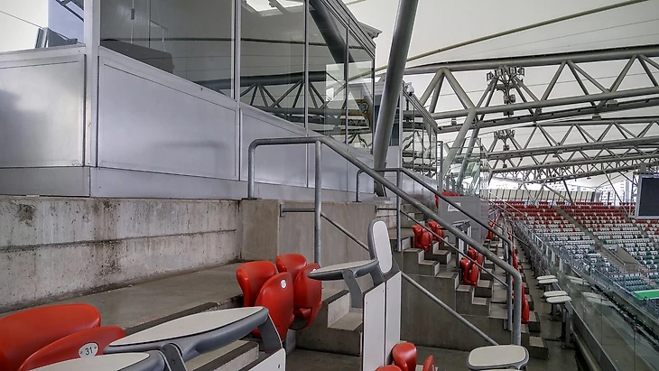 Трибуны стадиона отличаются от привычных российским болельщикам простором (места для ног куда больше, чем на "Открытии-арене", например) и высотой - даже если кто-то перед вами встанет, вам все равно все будет видно. На всех трибунах, кроме ультрас, можно заказать еду и напитки через приложение клуба.