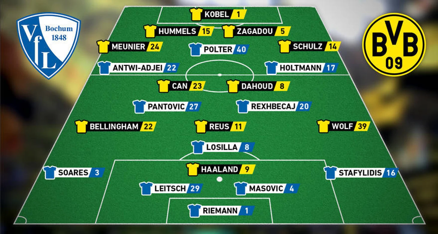 Александр Циклер, в отсутствие дисквалифицированного Марко Розе, взял на себя руководство «Боруссией» со скамейки запасных. Построение гостей было 4-2-3-1 с Джаном и Даудом перед четверкой защитников: Грегор Кобель, Нико Шульц, Матс Хуммельс, Дан-Аксель Загаду, Томас Менье, Эмре Джан, Махмуд Дауд, Джуд Беллингем, Марко Ройс, Мариус Вольф и Эрлинг Холанд.