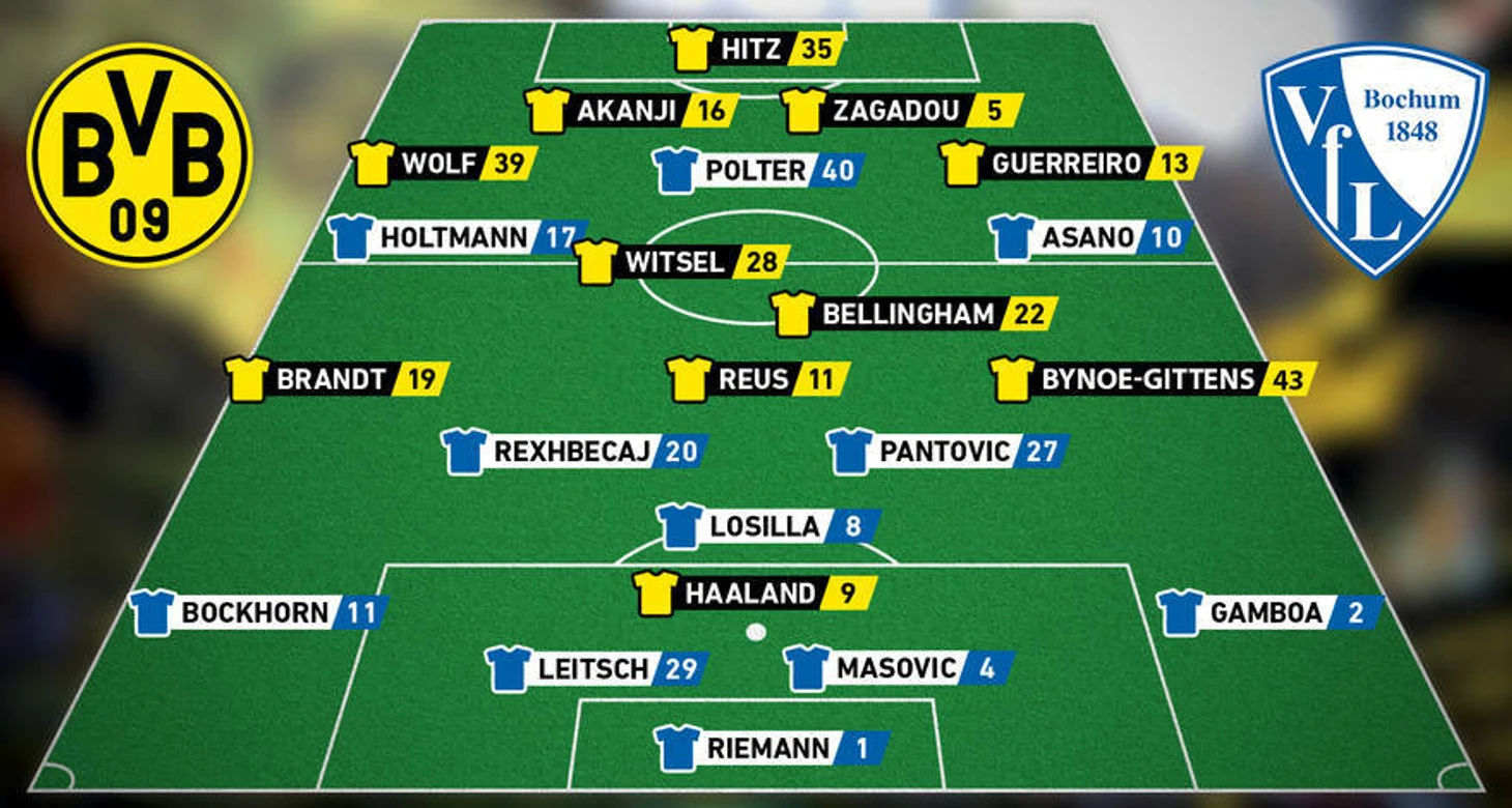 «Боруссия» играла по схеме 4-2-3-1: Mapвин Хитц, Рафаэль Геррейро, Дан-Аксель Загаду, Мануэль Аканджи, Мариус Вольф, Джуд Беллингем, Аксель Витсель, Марко Ройс, Юлиан Брандт, Джейми Байно-Гиттенс и Эрлин Холанд. Таким образом, из-за большого числа травмированных и при уже решенной задаче на сезон, в стартовом составе вышел 17-летний англичанин Джейми Байно-Гиттенс.