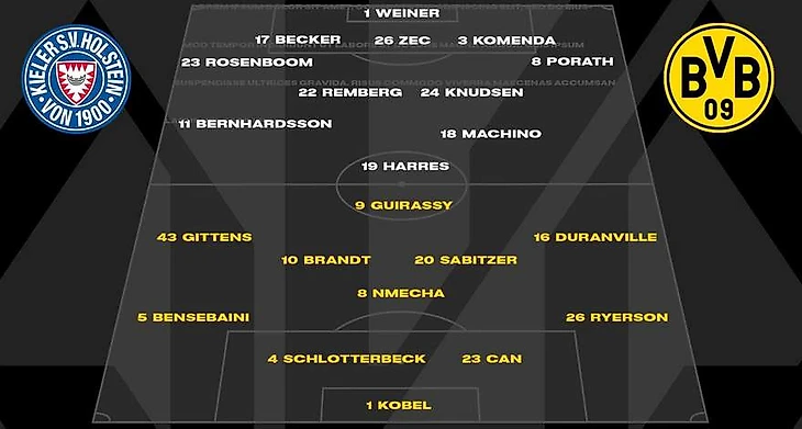 Главный тренер черно-желтых Нури Шахин дождался-таки возвращения в строй большей части больных и имел возможность выбирать, кого ставить в стартовый состав: Грегор Кобель, Рами Бенсебаини, Нико Шлоттербек, Эмре Джан, Юлиан Рюэрсон, Феликс Нмеча, Марсель Забитцер, Джейми Гиттенс, Юлиан Брандт, Жюльен Дюранвиль и Серу Гирасси.