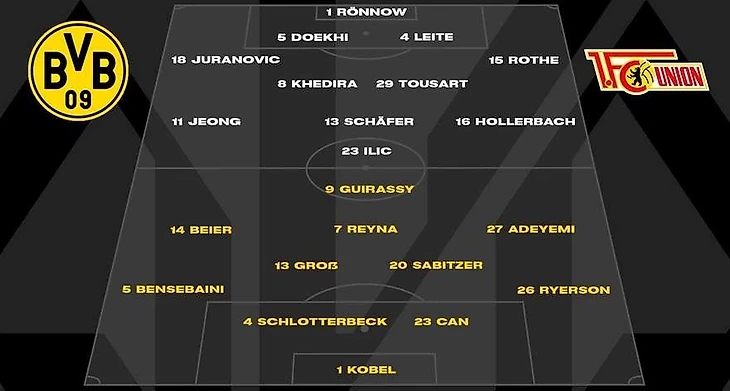Обе команды действовали по схеме 4-2-3-1, но с совершенно разными подходами и задачами. «Унион» выставил Шафера, игрока, больше ориентированного на оборону собственных ворот, на позицию «десятки» и искал возможности для прессинга на половине поля Дортмунда, чтобы спровоцировать игроков в черно-желтой форме на ошибки. В «Боруссии» же при собственном владении мячом Бенсебаини перемещался с левого фланга обороны в центр полузащиты рядом с Забитцером, а Гросс смещался на одну позицию вперед и располагался левее рядом с Рейной.