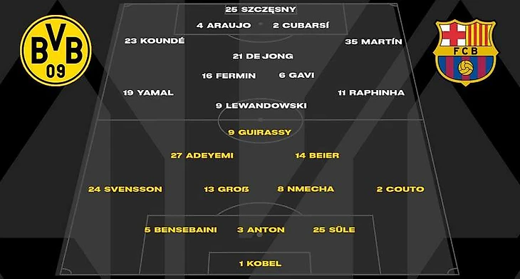 А в Дортмунде на стадионе «Сигнал Идуна Парк» «Боруссия» принимала «Барселону». Главный тренер испанцев Ханс-Дитер Флик выставил на игру достаточно боевой состав на данный момент, учитывая непростой календарь: Войцех Щенсны, Херард Мартин, Рональд Араухо, Пау Кубарси, Жюль Кунде, Френки де Йонг, Гави, Фермин Лопес, Рафинья, Ламин Ямаль и Роберт Левандовски.