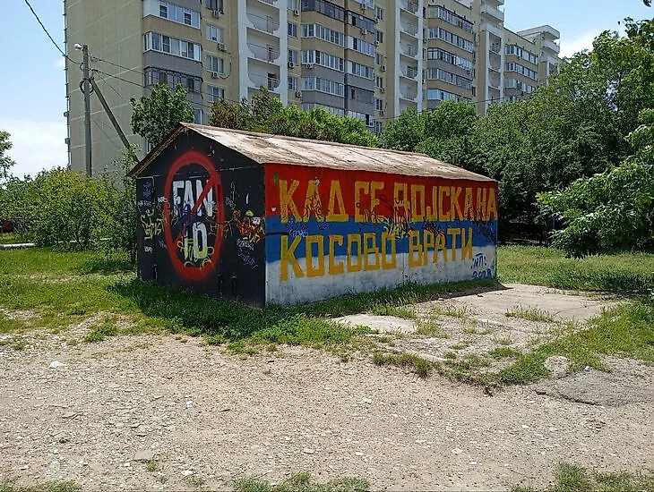 Чуть дальше граффити на сербском – видимо, от фанатов «Црвены Звезды», которые приезжали сюда в 2017-м на матч Лиги Европы. И заброшенное баскетбольное кольцо, спрятанное в траве.