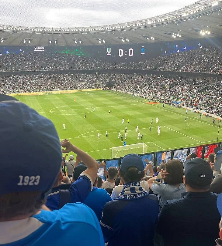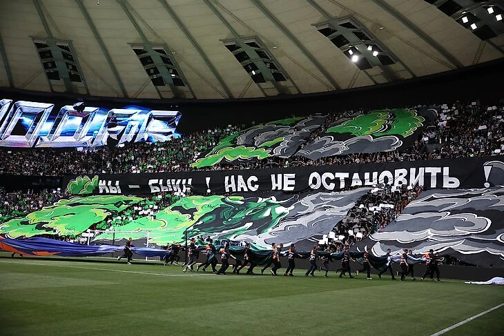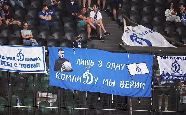 Матч. Массивный сектор «Динамо» пробует заряжать, но их за полминуты сминает остальной стадион. Добивая огромным баннером и ярким перфомансом.