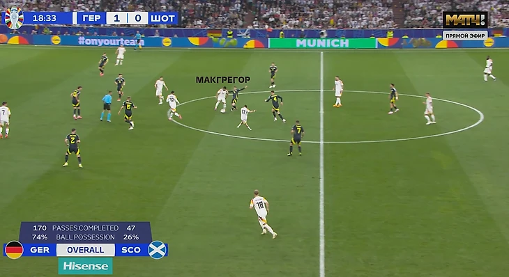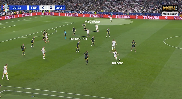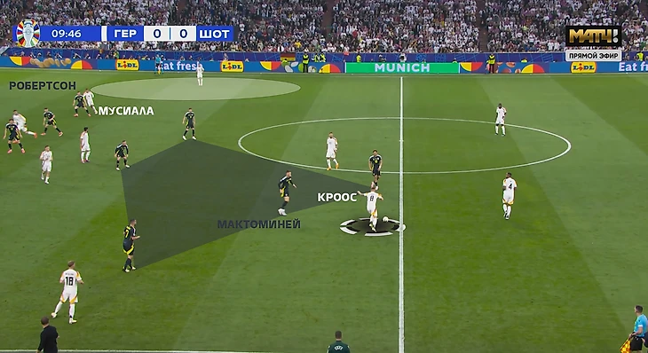 В принципе, гол возник из-за похожей ситуации. У Шотландии прессингующий блок из 5 человек. Здесь уже опорник Мактоминей выдвигается на Крооса чтобы хоть как-то обозначить давление, но немец снова выполняет перевод на другой фланг, потому что Мусиала снова уводит Робертсона ближе к центру: