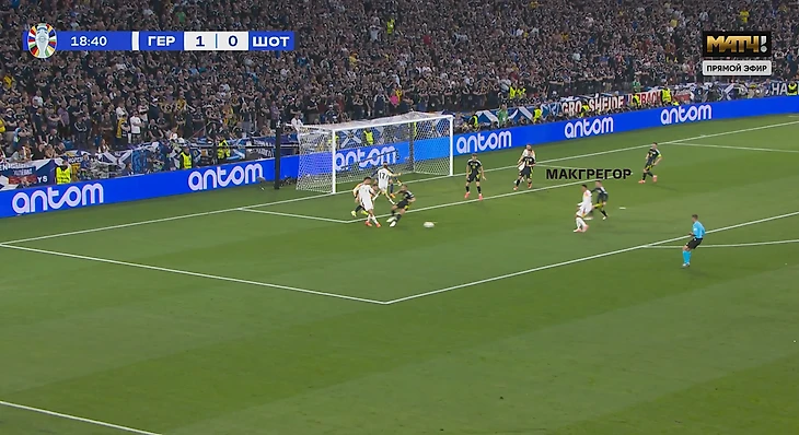 Германия продолжала владеть мячом и чуть меньше чем через 10 минут удвоила преимущество. Макгрегор не отобрал мяч в центре: