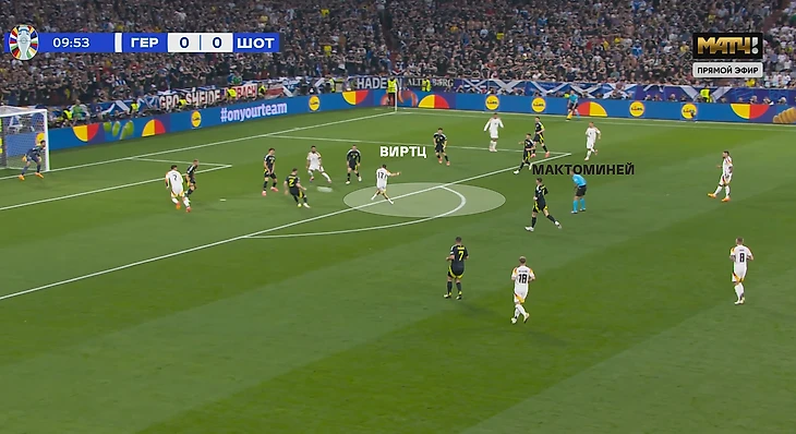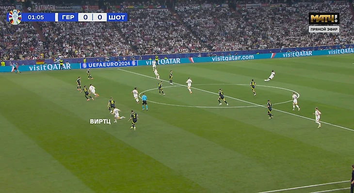 У Шотландии средний блок 5-4-1, но при этом они не опускают низко свою линию защиты, а при длинных передачах делают искусственные офсайды. Так получилось уже на 2 минуте: Рюдигер выполнял длинную передачу, а Виртц был в положении вне игры, из-за того, что защитники шотландцев сделали шаг вперед: