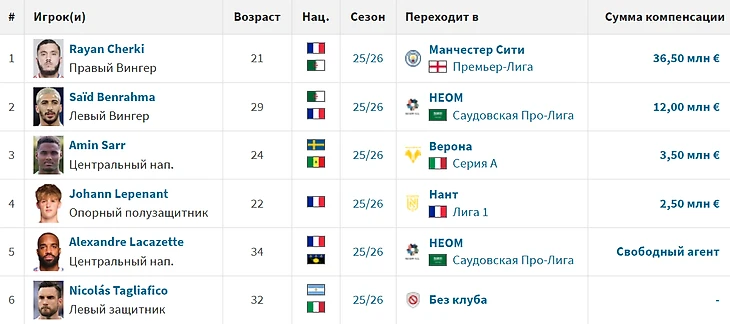 В начале июня за 36,5 млн был продан Райан Шерки, в этом месяце за 12 млн в аравийский «НЕОМ СК» перешел Саид Бенрахма, свободными агентами уходят Тальяфико и Ляказетт.