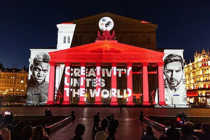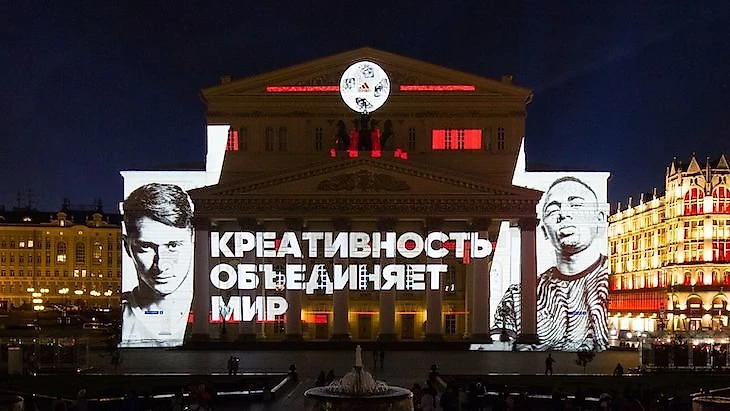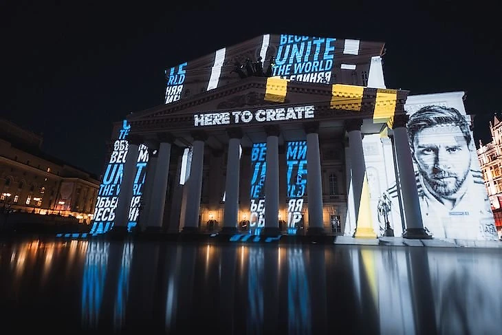Зрители проекции также увидели слоган «Вместе к победе» и официальный мяч турнира – Telstar18. Они стали свидетелями главной идеи кампании «Креативность решает» – «Креативноcть объединяет мир» («Creativity Unites the World»).