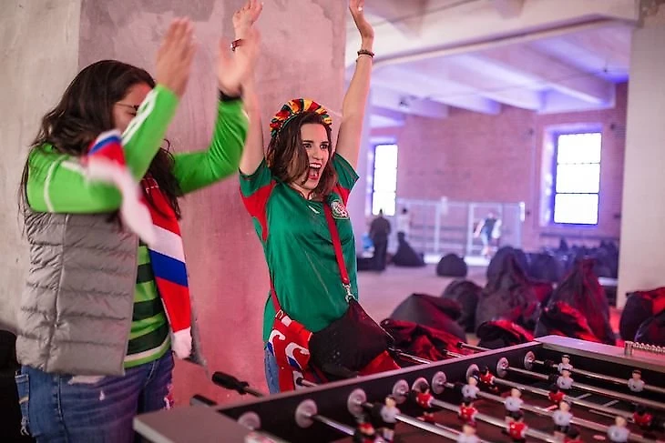 Первое, что бросается в глаза внутри огромного футбольного пространства — здоровенный логотип Tango League. Люди используют его как прессвол и постоянно фотографируются рядом. Сразу за этой конструкцией установлена главная достопримечательность базы — большое футбольное поле с трибунами и огромным экраном. Из колонок лупит одна из главных песен мира-2018 – This Is America Чайлдиша Гамбино. Кто-то поправляет диджея и говорит, что гораздо уместнее трек «This Is Россия».