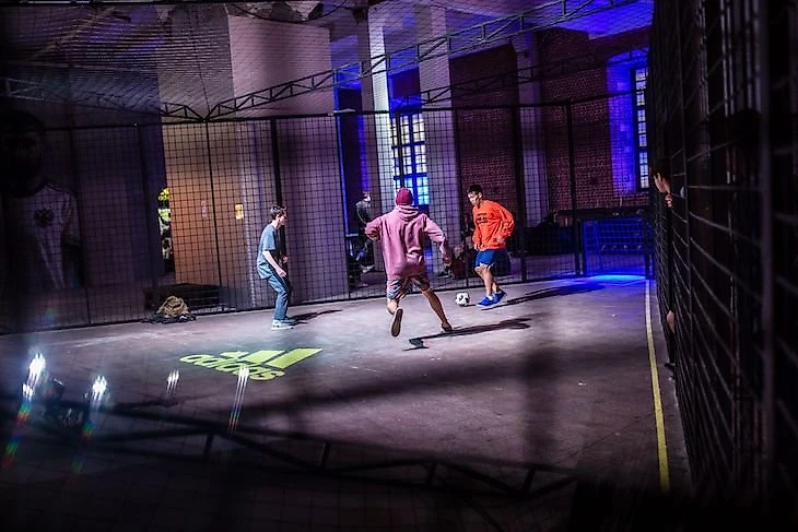 Сразу за футбольным полем расположилась большая сцена-помост с логотипом adidas — здесь вечером выступит Pharaoh. Юные девушки занимают места поближе за четыре часа до выступления. Поблизости – закрытая клетка, организаторы зазывают туда поучаствовать в панне. Прямо за сценой слышна крутая музыка и какие-то веселые крики — это еще одна зона на базе. Внутри – кикер, клетки для футбола, клетки для панны, настольный теннис. Неожиданно на празднике футбола обнаружилось баскетбольное кольцо, и оно пользовалось неимоверным спросом.