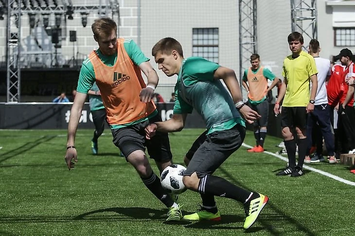 Люди оживленно следят за зарубами на поле. Парни сражаются за путевку в финал 14 июля в Москве, в котором примут участие лучшие команды серии adidas Tango League. Трибуны забиты болельщиками, начинающими по чуть-чуть разогревать голосовые связки перед матчем сборной России и Саудовской Аравии.