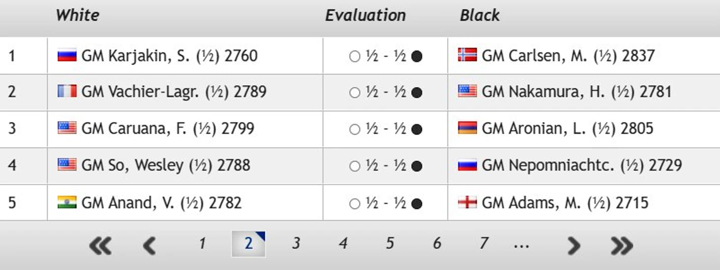 Вторая подряд партия чёрными фигурами для Ароняна. В этой партии зрителей ждала довольно скучная гроссмейстерская ничья: