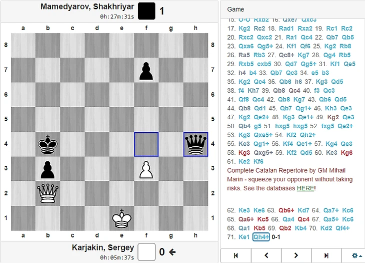 Сергей белыми опять сражался за ничью, но и половину очка вынести из партии не удалось. В начале партии Карякин бесстрашно схватил ферзем пешку на b7, вследствие чего у черных развилась инициатива. Россиянин решил спастись в "тяжелофигурном" эндшпиле, но недооценил силу проходных пешек черных. Шахрияр форсировал размен ладей и уже в ферзевом окончании проводил проходную. В критический момент партии, когда позиция стала повторяться, Мамедьяров спросил себя "а не цугцванг ли это?" и изящно передал очередь хода Сергею. Позиция белых стала рассыпаться, оценка компьютера неумолимо росла в пользу Шаха. В партии ещё была неточность со стороны азербайджанца и Карякин теоретически мог спастись единственными ходами, но в очередной критический момент партии он допустил ошибку, ставшую роковой. Вот так, вместо того, чтобы бороться в дебюте за перевес пришлось защищаться, изыскивая всевозможные ресурсы почти 6 часов, проиграв партию.