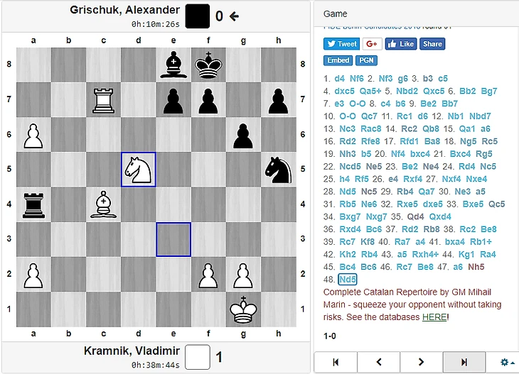 Если коротко, то партию скорее проиграл Александр, чем выиграл Владимир. Грищук буднично потратил львиную долю времени на относительно простые ходы, оказавшись в цейтноте уже к миттельшпильным осложнениям. В результате он проскочил через перспективную позицию и получил плохой эндшпиль. Крамник технично реализовал перевес.