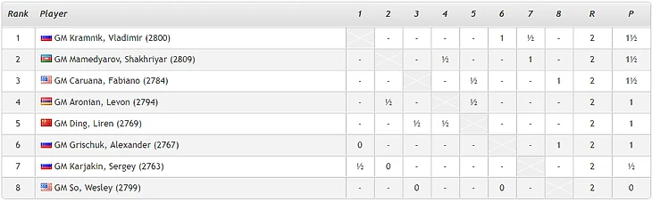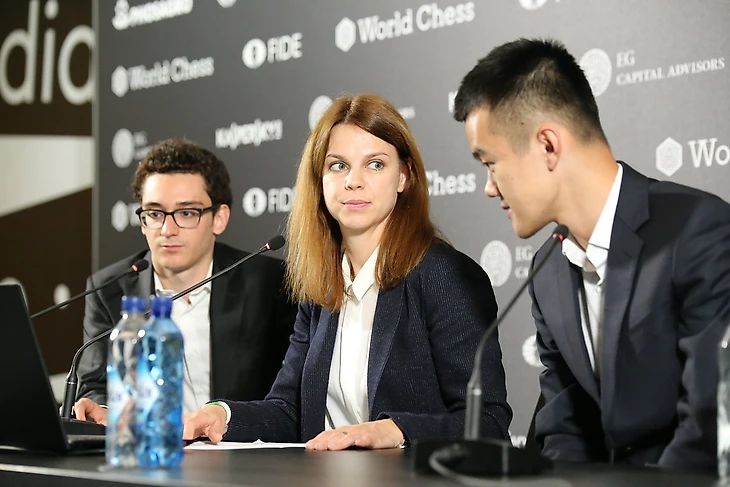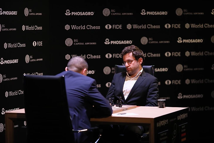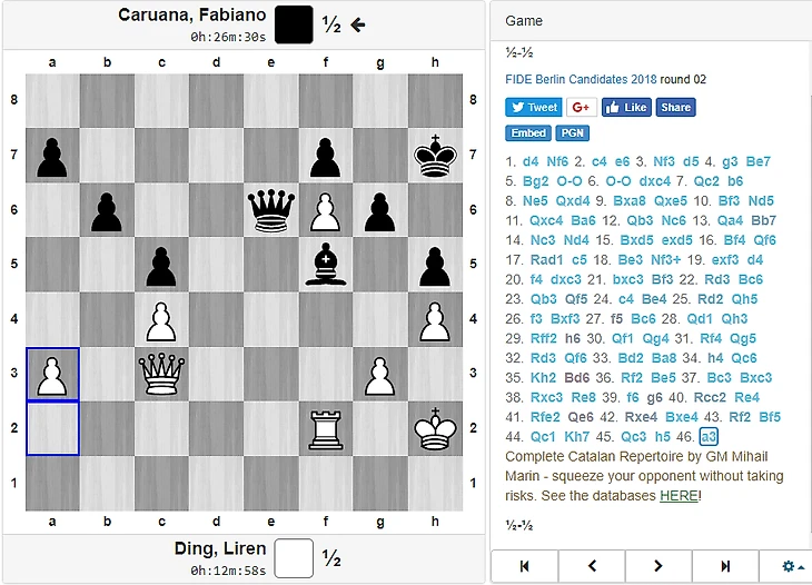Принципиально разыгранный дебют, смелая жертва качества от Каруаны, точная игра Дина, закономерная ничья.