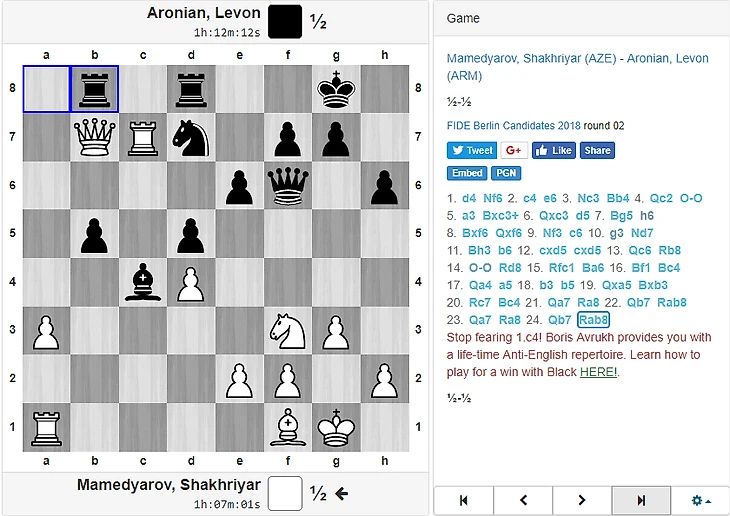 Коротенькая партия и закономерная ничья повторением ходов. Ферзь не уходит от бесконечных "приставаний" ладьи с полей а8 и b8: