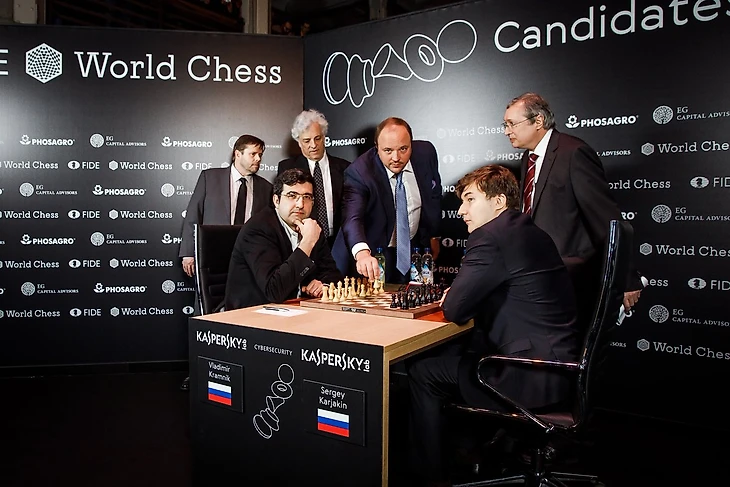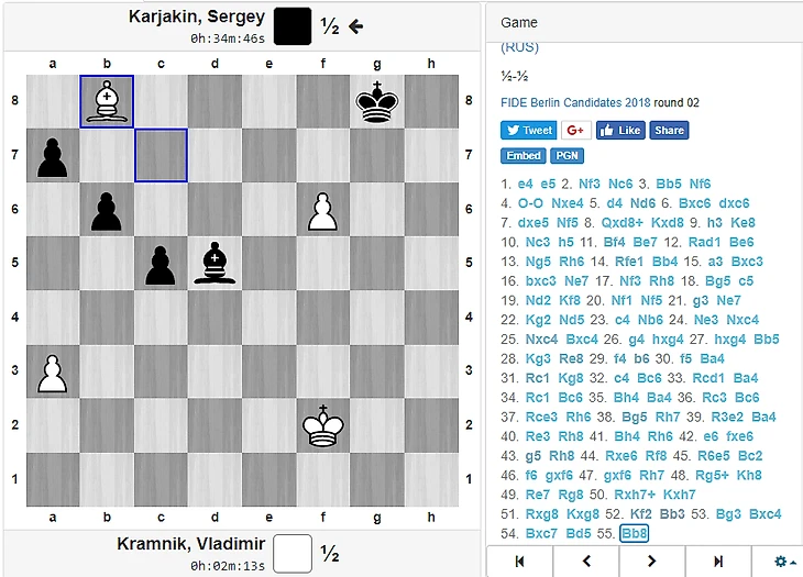 Берлинский вариант испанской партии разыграли два россиянина в Берлине. Все наслышаны про ничейную тенденцию "берлина". Было бы странно предрекать другой исход партии, ведь черными играл "министр обороны". Однако не всё так просто. Крамник заставил задуматься соотечественника демонстрацией относительно свежих идей. Но Сергей не был бы Карякиным, если бы не удержал ничью в пассивной позиции.