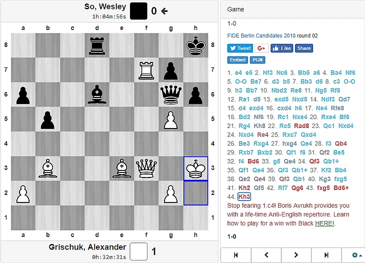 Самая эпичная партия тура. Александр вновь заставил нервничать болельщиков, когда получил выигранную позицию, но "подвесил" время. До контроля оставалось несколько ходов, а на часах было меньше минуты, когда Грищук понял главное - нужно ничего не испортить в цейтноте. Ему это, конечно же, удалось. Сделал пару-тройку нейтральных ходов, где-то повторил позицию, получил регламентированные 50 минут на 40-ом ходу и заставил сдаться американца. Конечно, радует и миттельшпиль Александра, он как в золотые годы шахмат, реализовал план по мобилизации ладей и добился подавляющего позиционного перевеса.