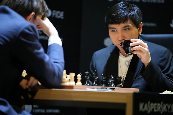У черных были претензии на перевес, когда у слона не осталось оппонента, а белый король едва не "простудился" из-за "белопольного сквозняка": это маячила угроза мата по комплексу слабых полей. Гроссмейстер из Поднебесной нашел точные защитительные ресурсы и в какой-то момент мог перехватить инициативу, но партия завершилась на этой позиции: