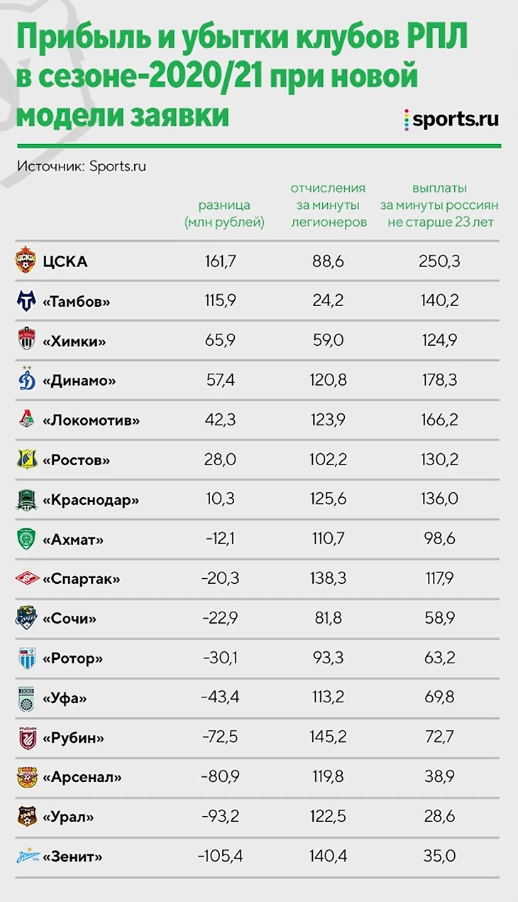 Какие же итоги принес новый лимит через год своего существования? В ЕК - опять полный провал: вылет Динамо и Ростова в квалификации ЛЕ, последние места в группах ЛЧ Зенита (1 очко), Локо (2), и 3-е Краснодара (5). Какие выводы сделал РФС? Может вспомнил наконец о сборной, для которой реально выбор кандидатов был сокращен гипотетически до 48 человек, но, учитывая 16 вратарей на 1 позицию в сборной, до 32 человек на 10 позиций? Да ну вас, какая сборная. Ведь у Зенита проблема с травмированными легионерами. И уже забыта фишка, на которую «купились» все 1,5 года назад: «Все, кто в заявке - могут быть на поле». И зимой 2022 предлагается новая формула: 13 легионеров (но только 8 могут выйти на поле одновременно) в заявке +12 местных. При этом опять закладывается «фишка» для введения в заблуждение не искушенных - выплаты за использование на поле игроков с российским паспортом. И даже «рупор» Зенита на Sports.ru составляет табличку, с «планируемыми доходами/расходами» за это.