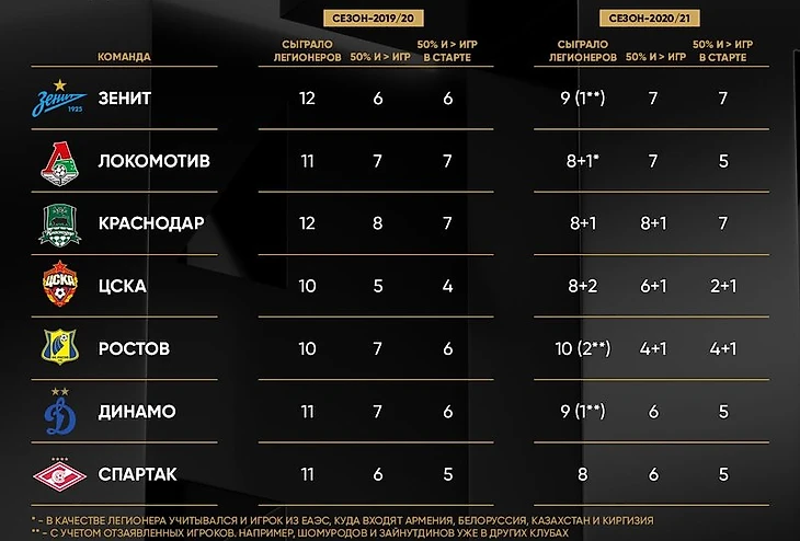Общественное мнение было подготовлено и новый лимит на сезон 2020/21 приняли по формуле 8+17. Почему именно такой - просто посмотрите на 2-ой столбец Таблицы. И вспомните, что перед сезоном 2020/21 в Зенит пришел Малком, не сыгравший ни разу осенью из-за травм - он и должен был быть «восьмым». Т.е именно потому, что Зенит имел 3 более-менее устраивающих по классу русских (Лунев, Дзюба, Кузяев/Оздоев) и 8 сильных легионеров. Никто из оставшихся команд - лидеров РПЛ к такому готовы не были, и проголосовали «за» под сказки о том, что теперь тренерам не надо думать, кого выпускать на замену со скамейки запасных. Зато через год Президент Зенита начал упрекать остальные клубы, что СБГ имеют 8 статусных легионеров, а остальные - могли бы, но не «купили».
