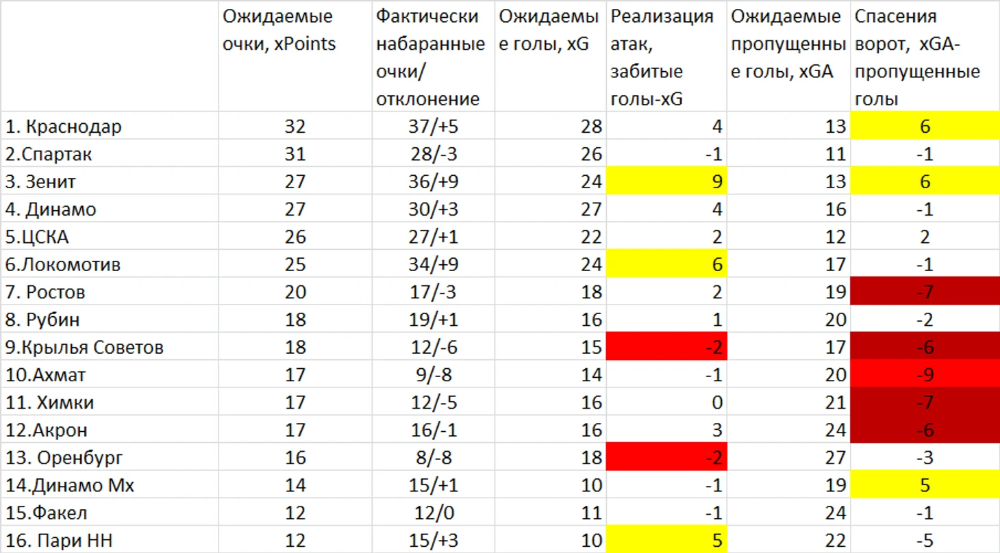 Спартак был вторым по ожидаемым очкам, но только 3-им по ожидаемым голам и 5-ым в «реале» по очкам за счет плохой реализации и средней игры вратаря при самой надежной обороне (минимальное количество ожидаемых голов соперника).