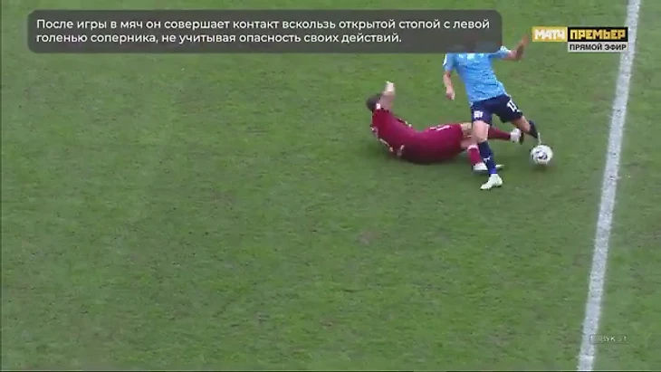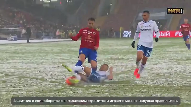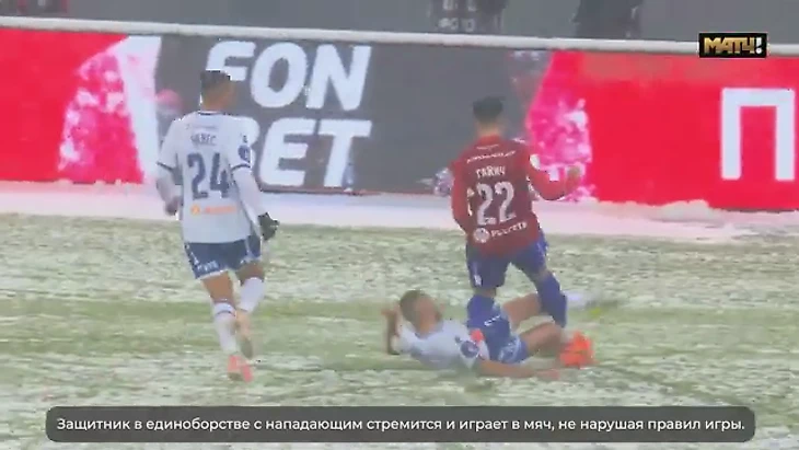 где защитник выбивает мяч вместе с ногами атакующего, что прямо противоречит надписи на скрине, и особенно заметно на скрине с другой стороны, сделанном в этот же момент времени