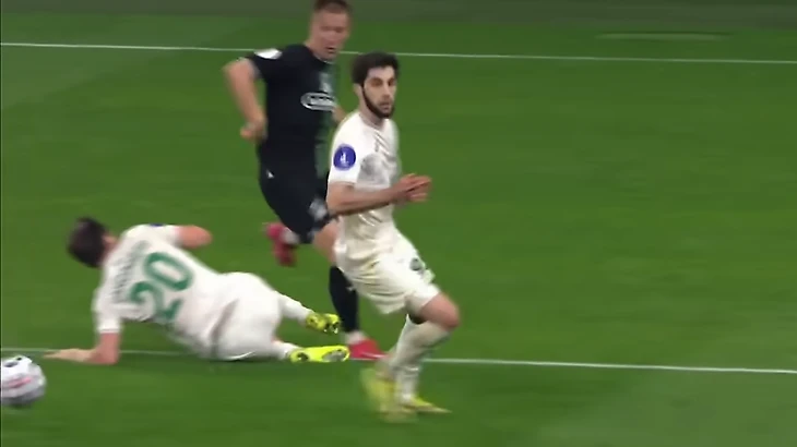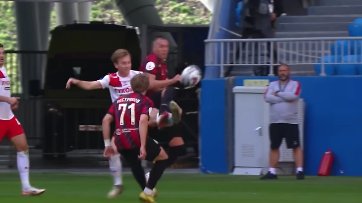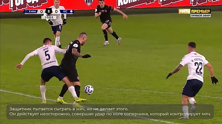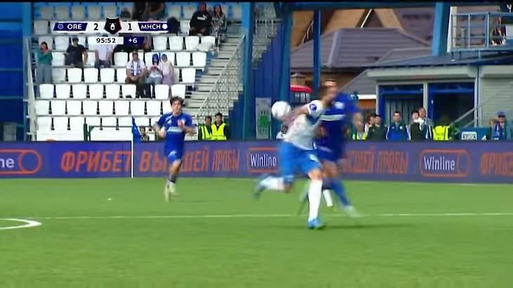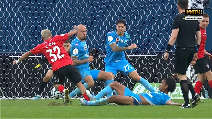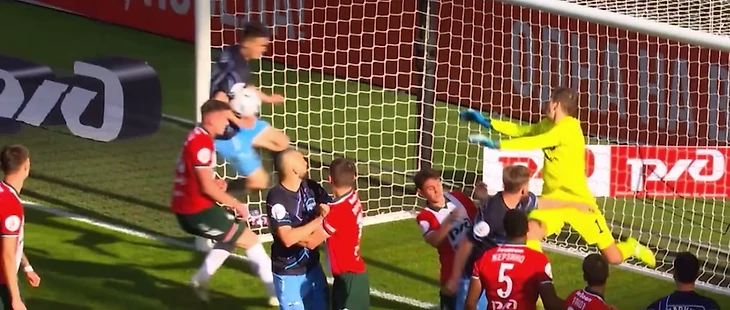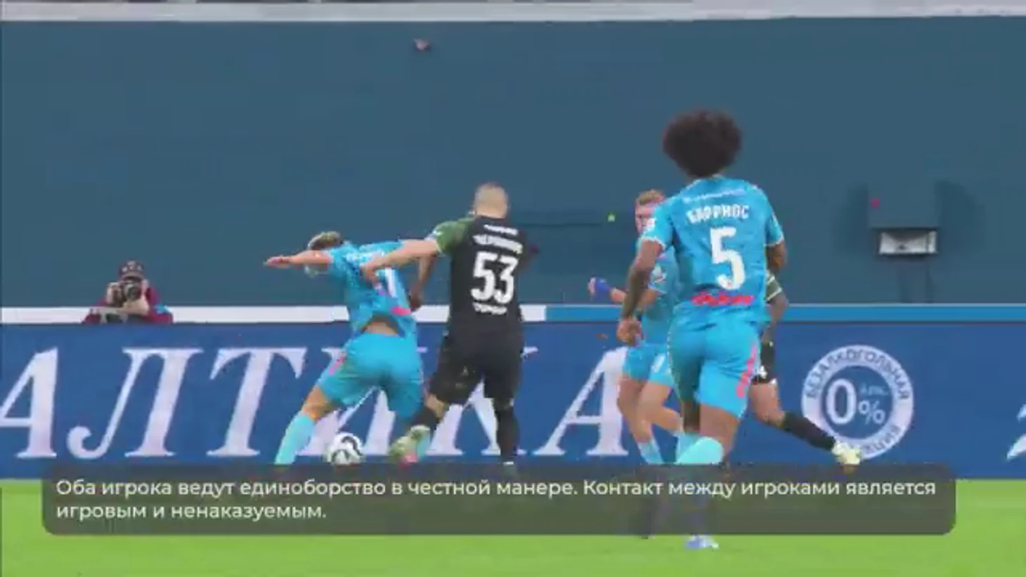 Я уже как минимум 3 раза ( в обзорах 1 круга по играм Зенит - Оренбург, Оренбург - КС, Краснодар - Ростов) объяснял: если человек в воздухе и его толкают, то он летит в сторону толчка всем телом, и ноги даже обычно оказываются впереди остальной части тела. «Выгнуться дугой» от толчка игрок может только стоя на земле, если он так делает в прыжке - это происходит по его желанию, и это - чистой воды симуляция. Посмотрите любой баскетбольный матч - там почти всегда будет 2-3 момента с толчками в прыжке, и «дугой» никто и никогда не изгибается, а вот стоя на паркете - частенько. Ну а в конце игры - еще один «фэйл» с удалением за «лишение явной возможности забить гол» вот в этом моменте: