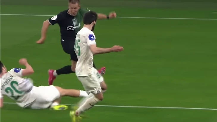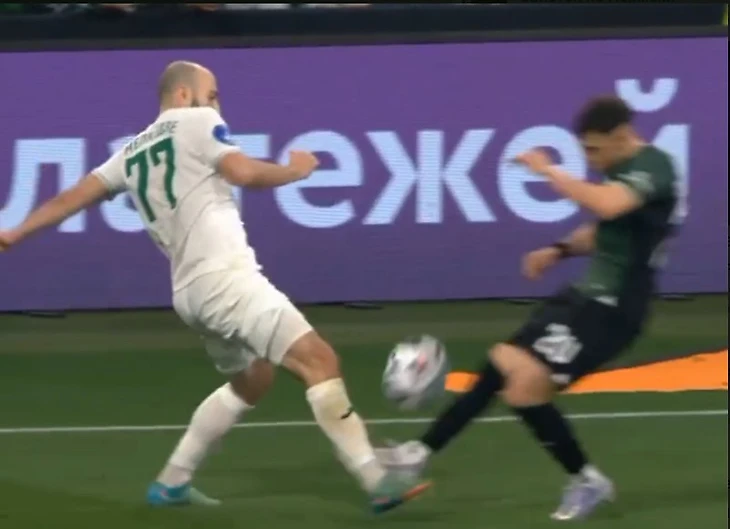Игра в Самаре Акрона и Спартака ожидалась с большим интересом, чем первая: Дзюба против Спартака - история всегда громкая. И матч в итоге оправдал ожидания, уже на 17 минуте Умяров опоздал вступить в борьбу за мяч и после того, как Артем пробросил себе мяч на ход, ударил по ноге нападающего. Кто скажет, что это пенальти «имени Комличенко» - не прав, что хорошо видно по картинке