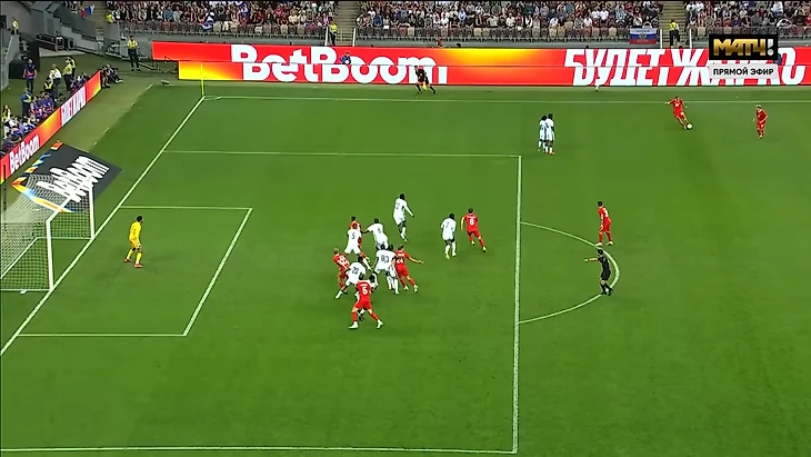 Но Сафонов спас сборную при выходе 1 на 1. Низкая игровая дисциплина в обороне сборной РФ и в дальнейшем проявлялась вовсю - сравните уже отмеченное на первом скрине и на нижеприведенном стандарте