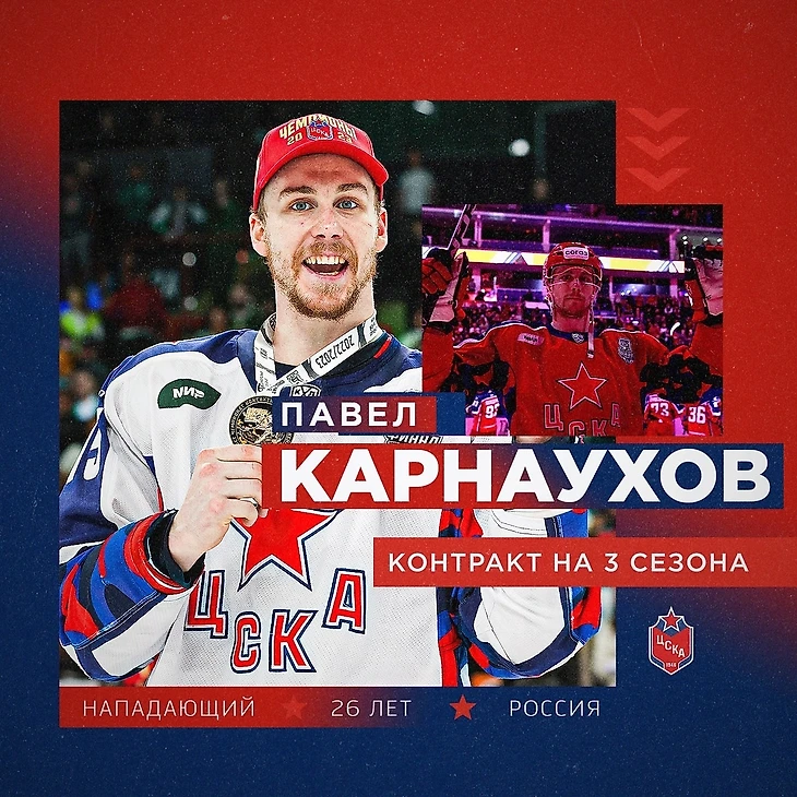 Нападающий продлил соглашение с армейским клубом до конца сезона 2025/26. В прошедшем регулярном чемпионате Карнаухов провел 60 матчей, в которых набрал 29 (14+15) очков при показателе полезности «+4». В плей-офф на счету форварда 27 игр и 8 (3+5) очков. Павел Карнаухов является воспитанником хоккейной школы ЦСКА. С «Красной Армией» в сезоне 2016/17 форвард выиграл Кубок Харламова. В составе главной команды нападающий стал трехкратным обладателем Кубка Гагарина.