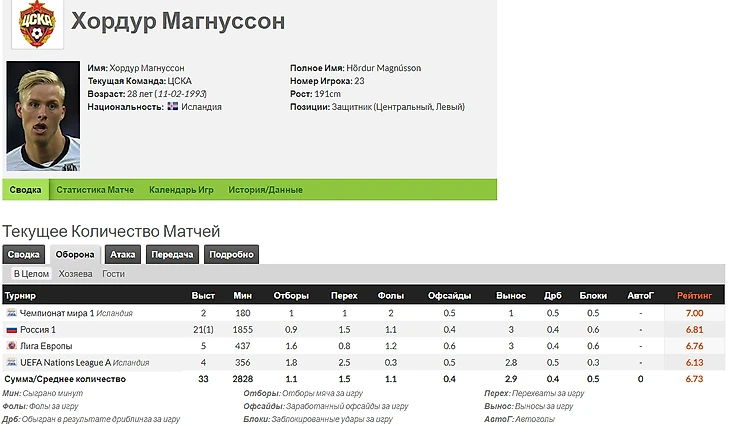 Как мы видим из таблицы, исландец совершает около одного отбора в среднем за игру, полтора перехвата и около 1 фола. Довольно неплохая статистика для игрока, играющего в нашем чемпионате. Средняя оценка действий тоже достойная. Предлагаю не смотреть на статистику игрока в составе сборной, так как исландцы играют в немного более оборонительный футбол по сравнению с ЦСКА.