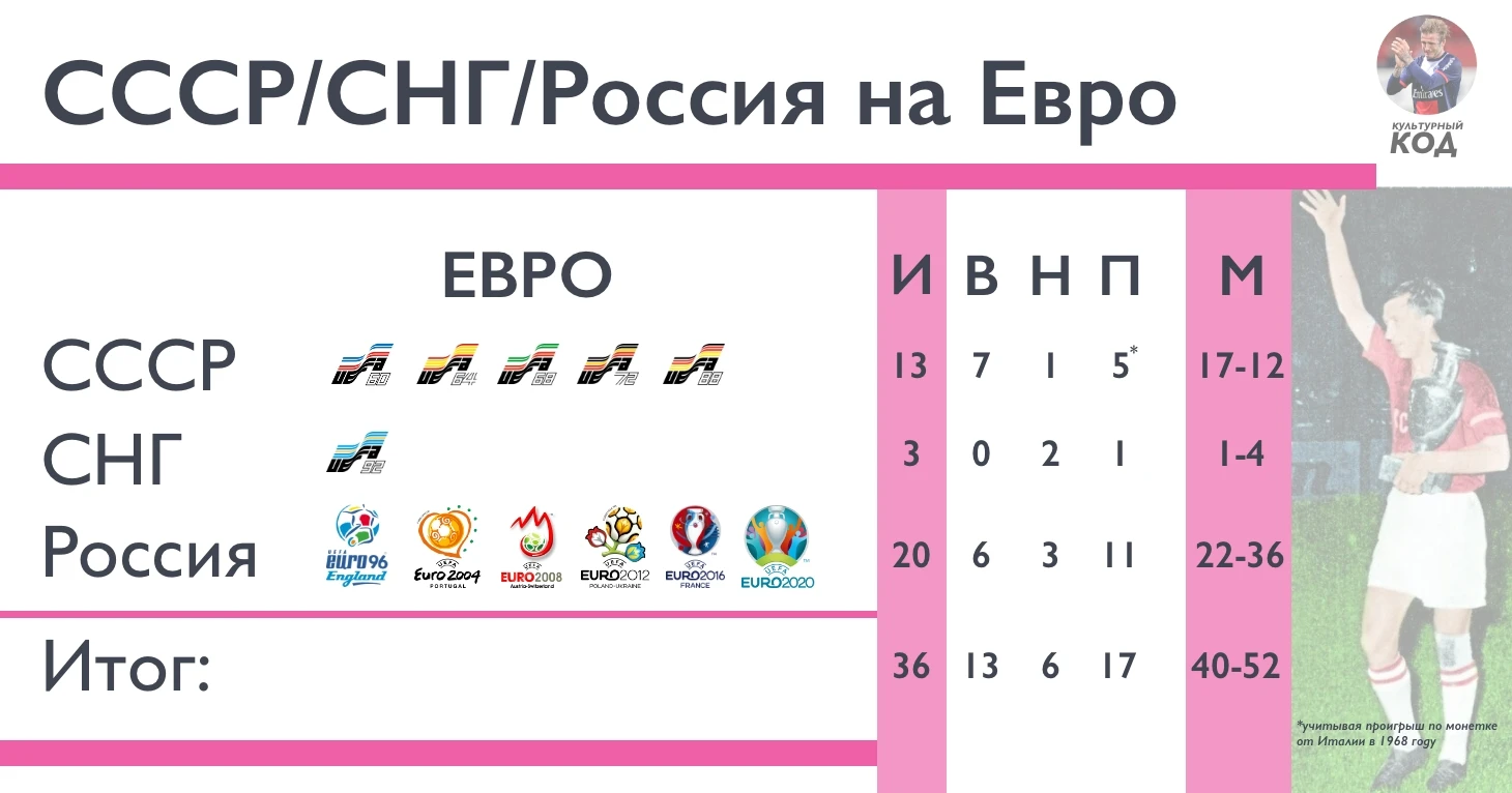 Тем удивительнее оказалась, что за все 36 матчей, за всю историю турнира, наша сборная, будучи и СССР, и СНГ, и Россией, лишь однажды сумела выиграть, проигрывая по ходу матча. Таких игр, где нам забивали первыми, было чуть больше половины – 19 – и после этого мы не выигрывали матч. Никогда. Исключение из этого только одно – финал первого Кубка Европейских наций в 1960 году.