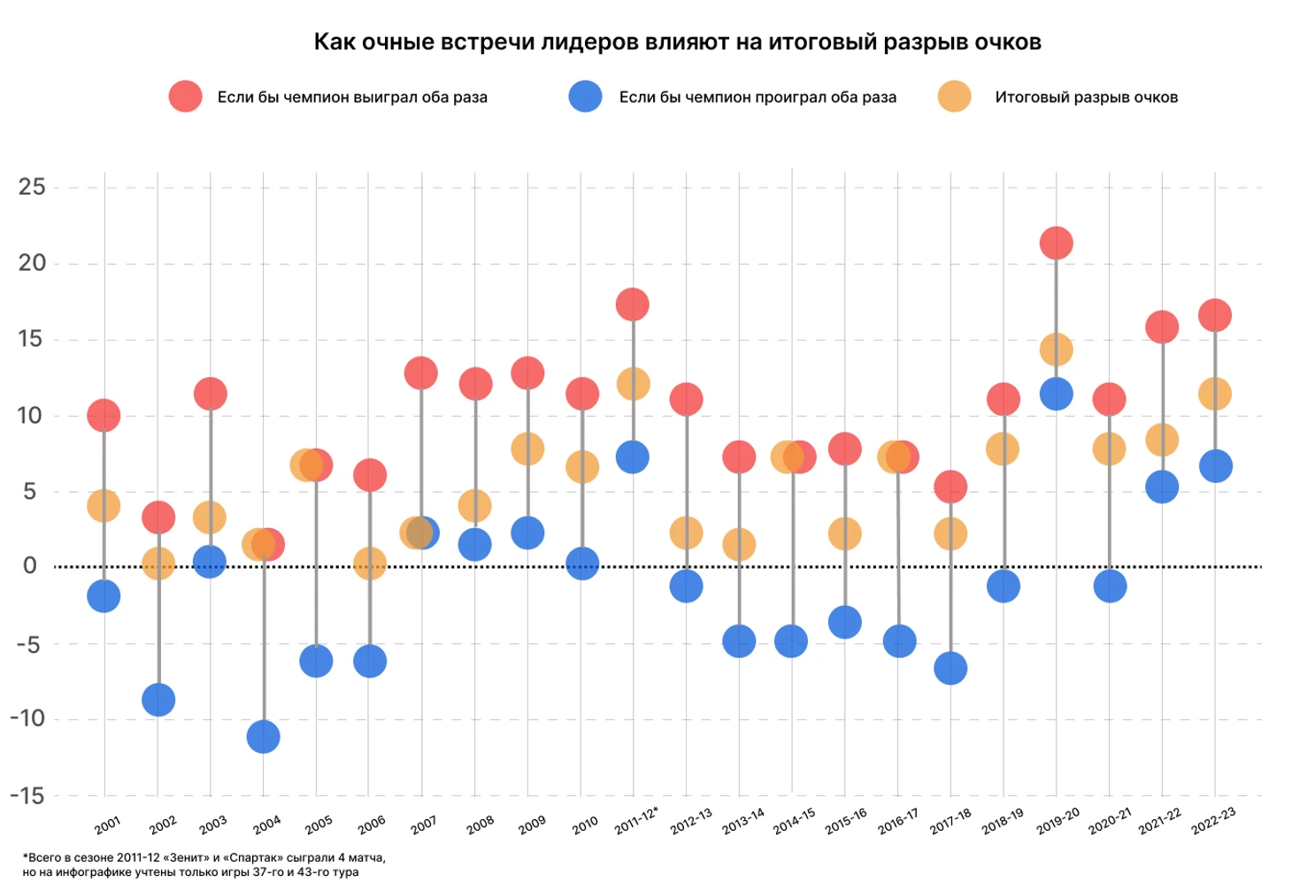 Ниже представлена инфографика, основанная на данных 22-х сезонов РПЛ. Она показывает, как итоговой разрыв очков менялся бы в зависимости от результата личных встреч.