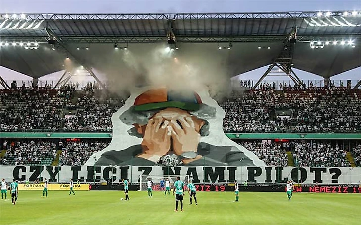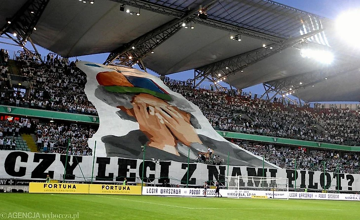 "Czy leci z nami pilot?" ("Пилот летит с нами?"). Отсылка к пародийной комедии 1980 года с Лесли Нильсеном. В нашем прокате картина известна под названием "Аэроплан". Смысл перфа в том, что "Легия" по итогам прошлого сезона впервые за 9 лет не взяла ни одного трофея, а президент клуба Дариуш Мьодуски (на баннере) устроил тренерскую чехарду, сменив уже 10 тренеров за 8 лет правления, причем в прошлом сезоне с "Легией" работали сразу три тренера.