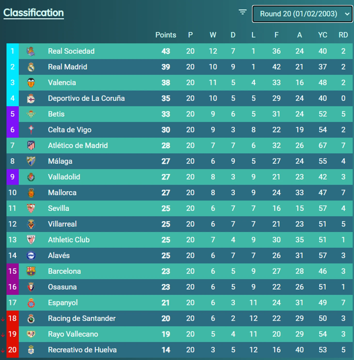В ЛЧ «Барса», в конце концов, квалифицировалась – в последнем туре влезла на четвертую строчку. По-прежнему идущие пятыми каталонцы принимали «Валенсию», от которой отставали на три очка, и одержали тяжелейшую победу 3:2, во многом, за счет гения Ривалдо – бразильский форвард оформил хет-трик (третий мяч отправил в сетку на 88-й минуте невероятным ударом через себя). Эта виктория позволила «Барселоне» сравняться с «Валенсией» по очкам и опередить ее в итоговой классификации Примеры, благодаря преимуществу в личных встречах.
