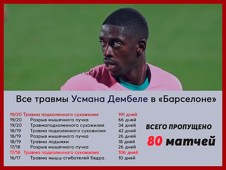 Усман виделся качественной сменой Неймару. Француз действительно считался качественным футболистом, техничным и быстрым универсалом с набором качеств, близким к бразильской суперзвезде (хоть уровень и абсолютно иной). Сезон в Германии оказался прорывным – 31 балл по системе «гол+пас» во всех турнирах являлся отличным показателем качеств молодого игрока. Дембеле казался беспроигрышным вариантом на перспективу, но его настигли злополучные травмы. Причем такая их постоянность и серьезность начались именно в Каталонии.