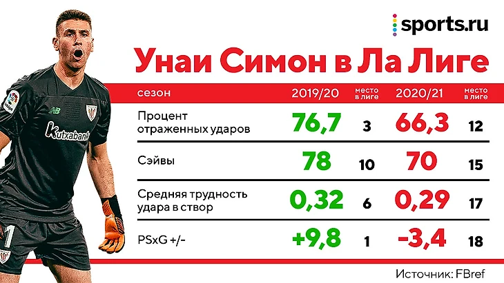 Вратарский PSxG показывает количество голов, от которых спас вратарь относительно среднего кипера. Показатель Унаи в позапрошлом сезоне – космос, в Ла Лиге-20/21 Облак показал идентичный результат – и стал лучшим вратарем в топ-5 лигах. Однако такой результат во многом был следствием в целом надежной обороны «Атлетика» того сезона и аномального везения. Сейчас везение закончилось, и цифры Симона упали.