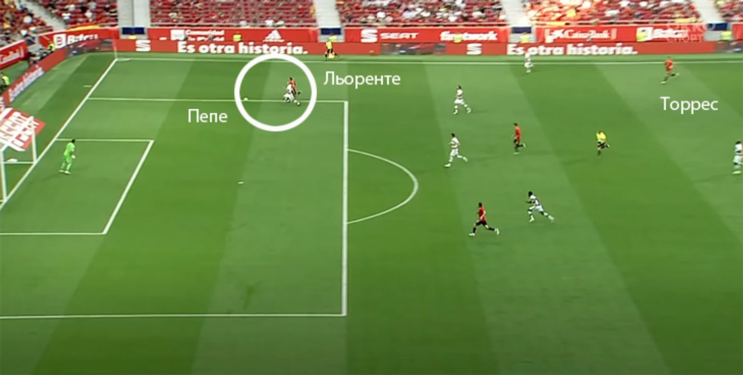 Фланговые защитники не успевают за Маркосом, и на него выдвигается Пепе. Так Льоренте создал больше пространства и для нападающих: