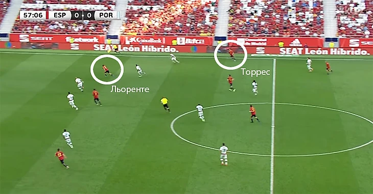 Пример из матча с Португалией. Ферран Торрес остается сзади, а Льоренте бежит на его позицию: