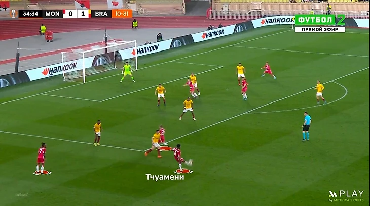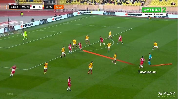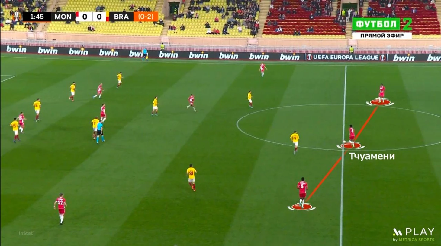 Проиллюстрируем их конкретным матчем против «Браги» в ЛЕ. Не очень хорошая игра француза, кстати, но это важно – при любом качестве Тчуамени все равно действует в разных позиционных режимах.