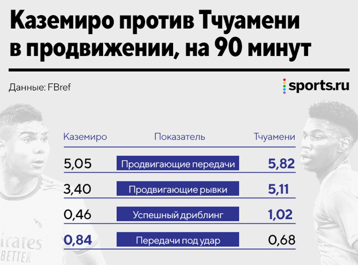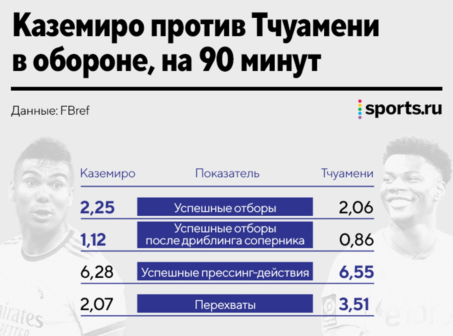 Тчуамени даже мощнее в некоторых оборонительных показателях, но стоит учитывать разницу и в стилистике команд, и в конкретных разрушительных функциях: у Тчуамени был Фофана, Каземиро убивает атаки в одиночку.