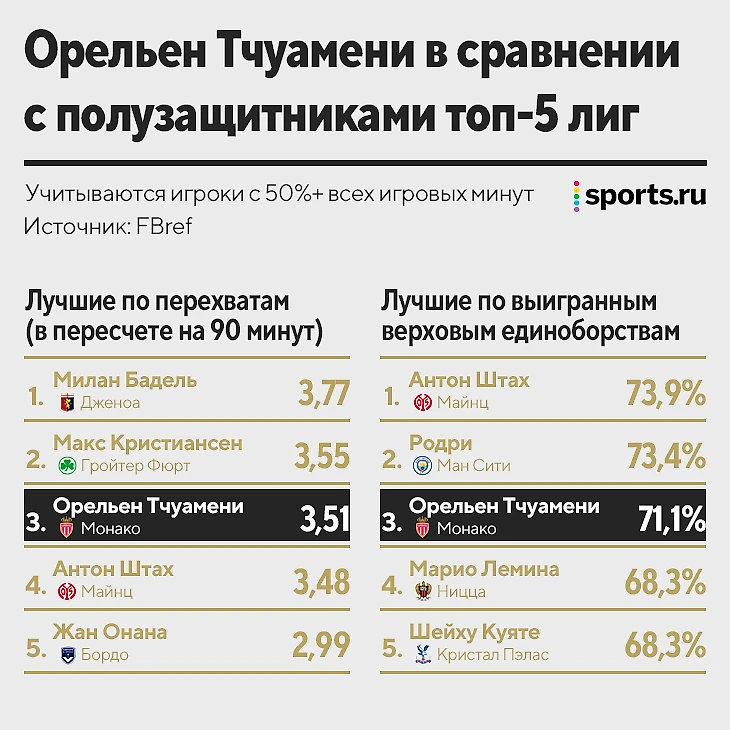 По перехватам Тчуамени лидирует в Лиге 1 и в абсолютном значении (103), и в пересчете на 90 минут (3,51). Он лучший полузащитник Франции по проценту выигранных верховых единоборств (71,1).