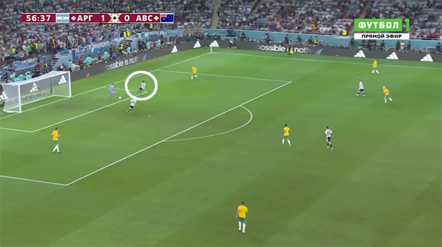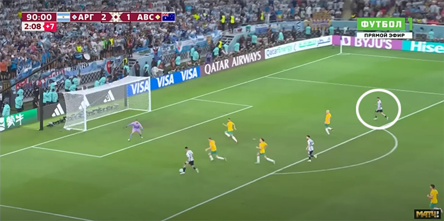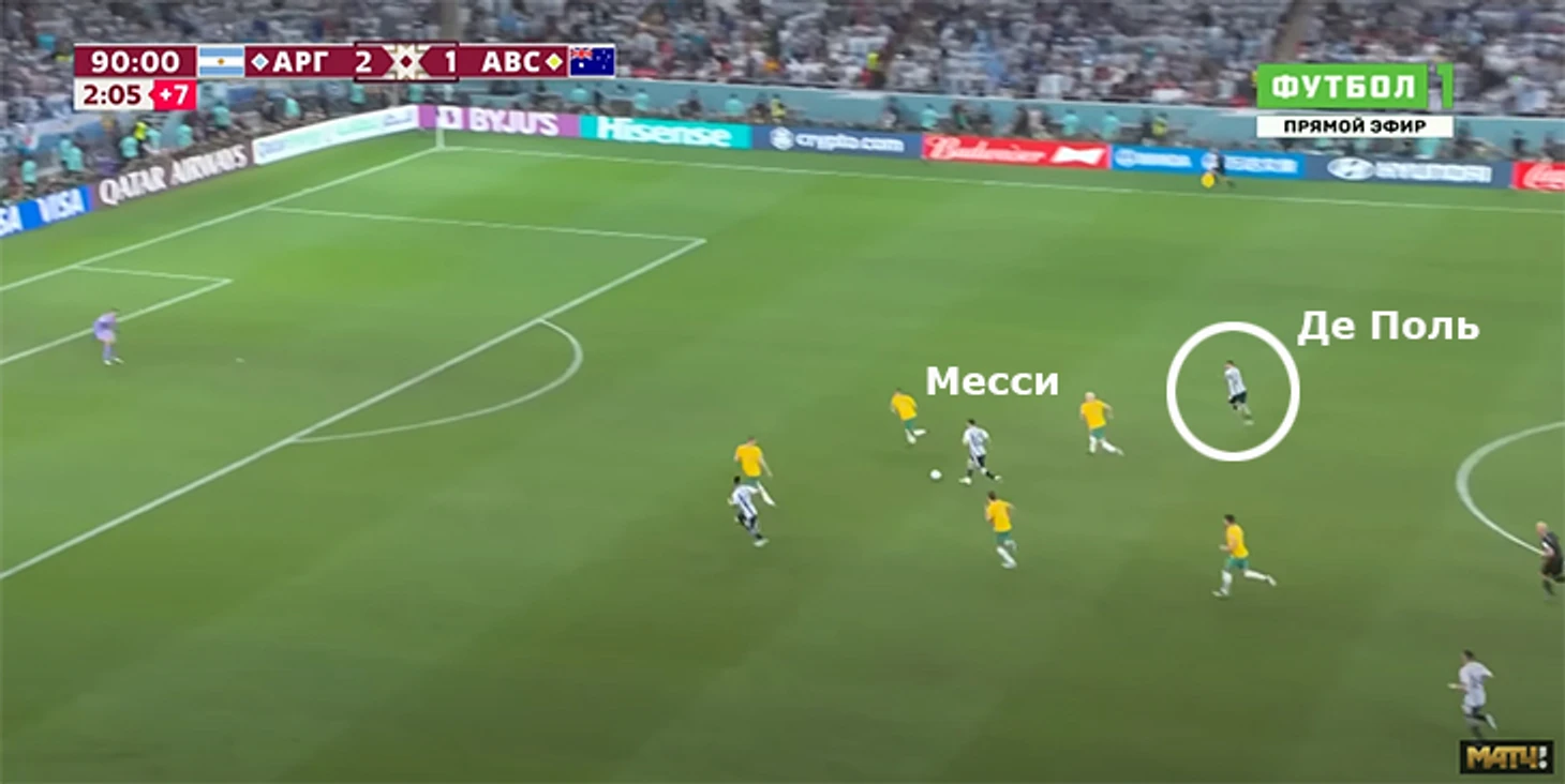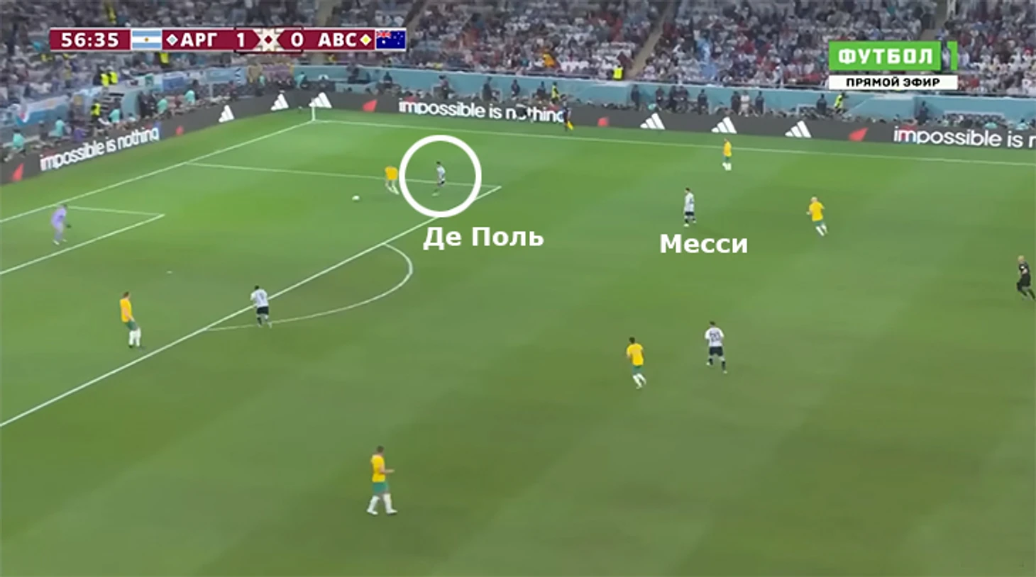 Роль Де Поля в сборной максимально разнообразна. Основная задача – всячески поддерживать Лео в прессинге, а иногда и вовсе выдвигаться вместо него. Пример из игры с Австралией – Родриго идет на кипера Мэтью Райана. Месси остается сзади.