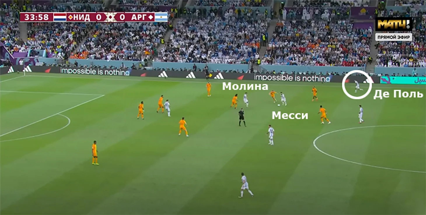 Родриго помогает не только Месси. В четвертьфинале с Нидерландами он менялся местами с партнером по «Атлетико» Науэлем Молиной – Де Поль оставался на фланге, а тот смещался в центр и комбинировал с Месси.