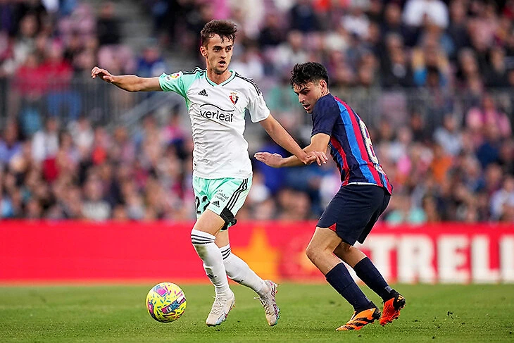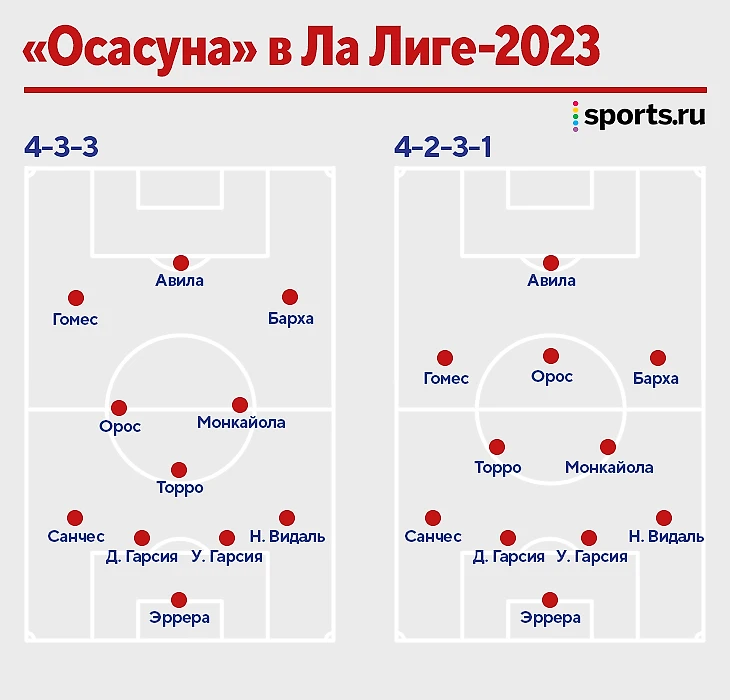 «Осасуна» начинала сезон с 4-4-2, но вскоре перешла к 4-3-3, трансформирующихся в 4-2-3-1 при прессинге. Важным ключом в переходах стал Мой Гомес, который уходит чуть глубже и оставляет фланг на латераля Ману Санчеса. Тренер четко распределяет обязанности между флангам: левый отвечает за регулярное давление, правый отведен под качества Кике Бархи, которого страхует Начо Видаль.
