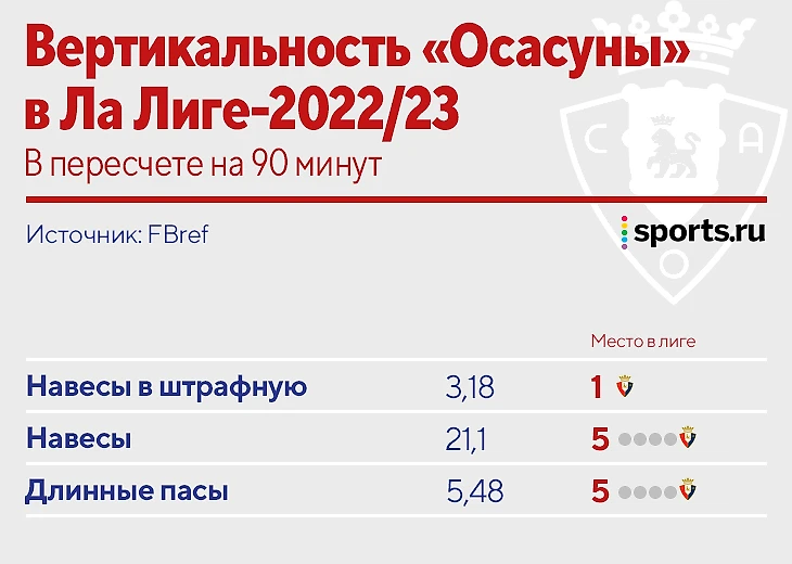 «Осасуна» вполне заслуживает звания самой вертикальной команды Ла Лиги. Они не просто много навешивают, как «Севилья» Лопетеги, а именно строятся через верховые передачи. Их принимают не головой, а ногами, хотя с приходом Анте Будимира (190 см) такой сценарий тоже часто практикуется. Если на поле 172-сантиметровый Авила, то навесы ищут подключающихся Хона Монкайолу (189 см) и Аймара Ороса (177 см).