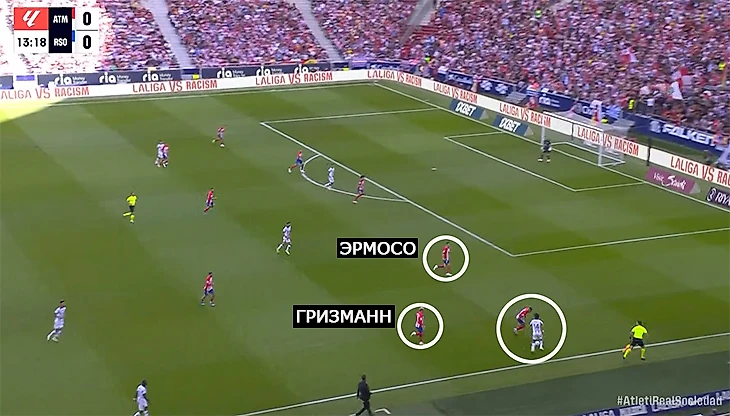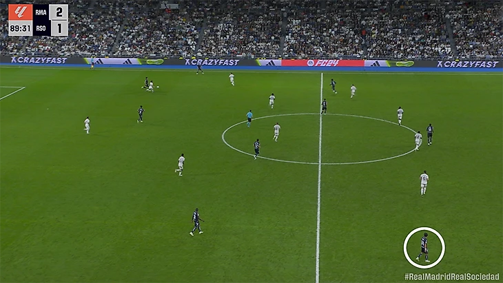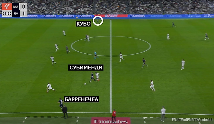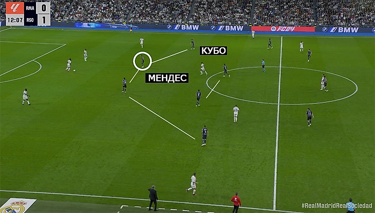 Хороший пример: «Реал» сваливается на левый фланг, помогает опорник Мартин Субименди. Команда Альгуасиля получила численное преимущество, пока «Мадрид» реагирует.